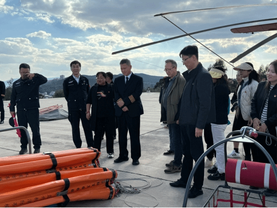 座谈会后,大家到直升机场进行参观,机组人员对消防装备进行了介绍,让大家进一步了解航空消防救援工作。