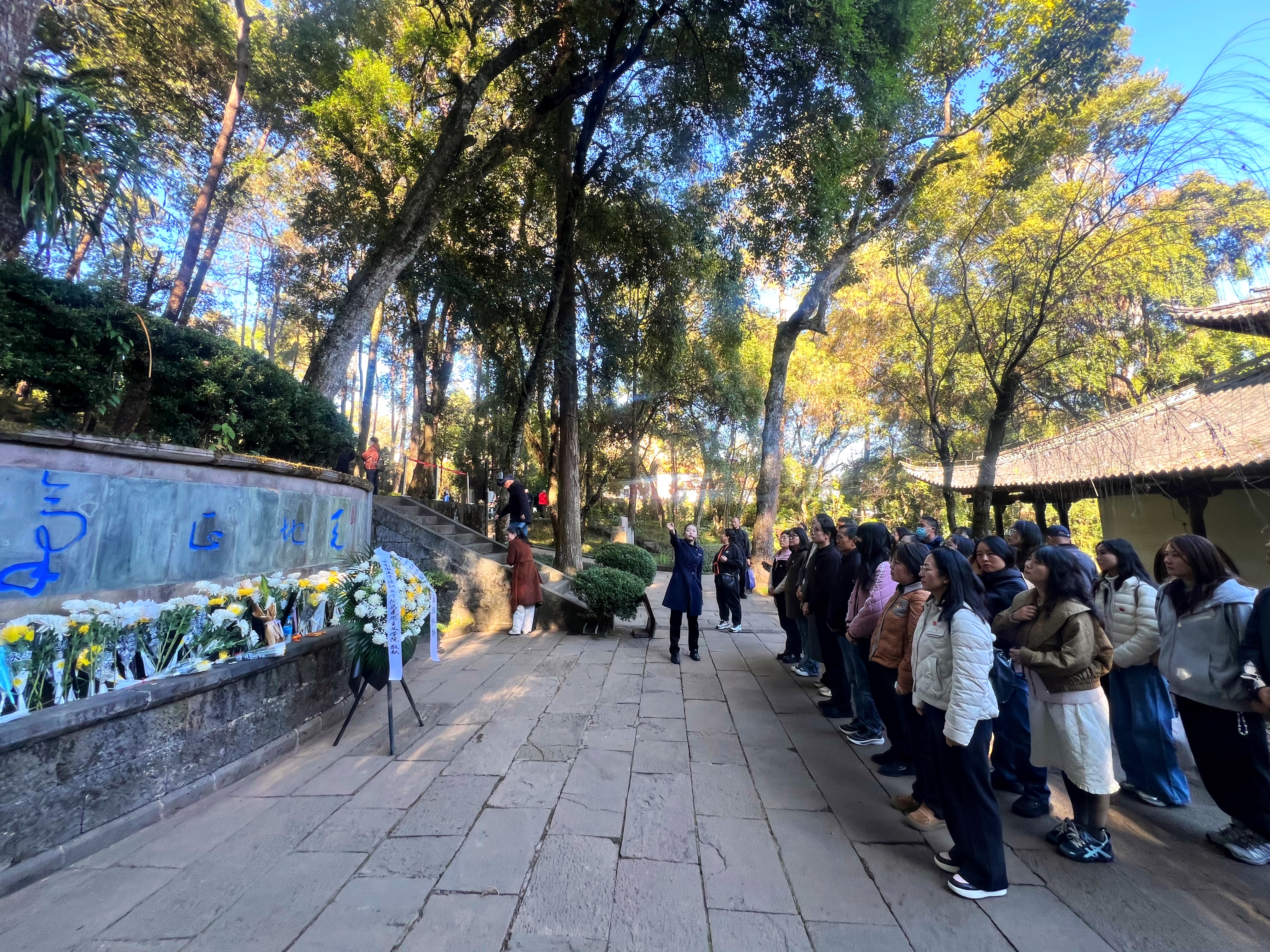 21日,滇西抗战纪念馆、国殇墓园、来凤山抗战遗址的现场教学,将参训教师们带回历史现场,聆听历史回声,深刻领悟了缅北、滇西大反攻胜利的来之不易,一个个英雄故事、一件件抗战文物,书写了“一寸山河一寸血”全民族抗战的滇西篇章。在国殇墓园,全体党员教师为滇西抗战中牺牲的英烈们敬献鲜花,崇尚英雄、尊重烈士,让英雄的旗帜高高飘扬。