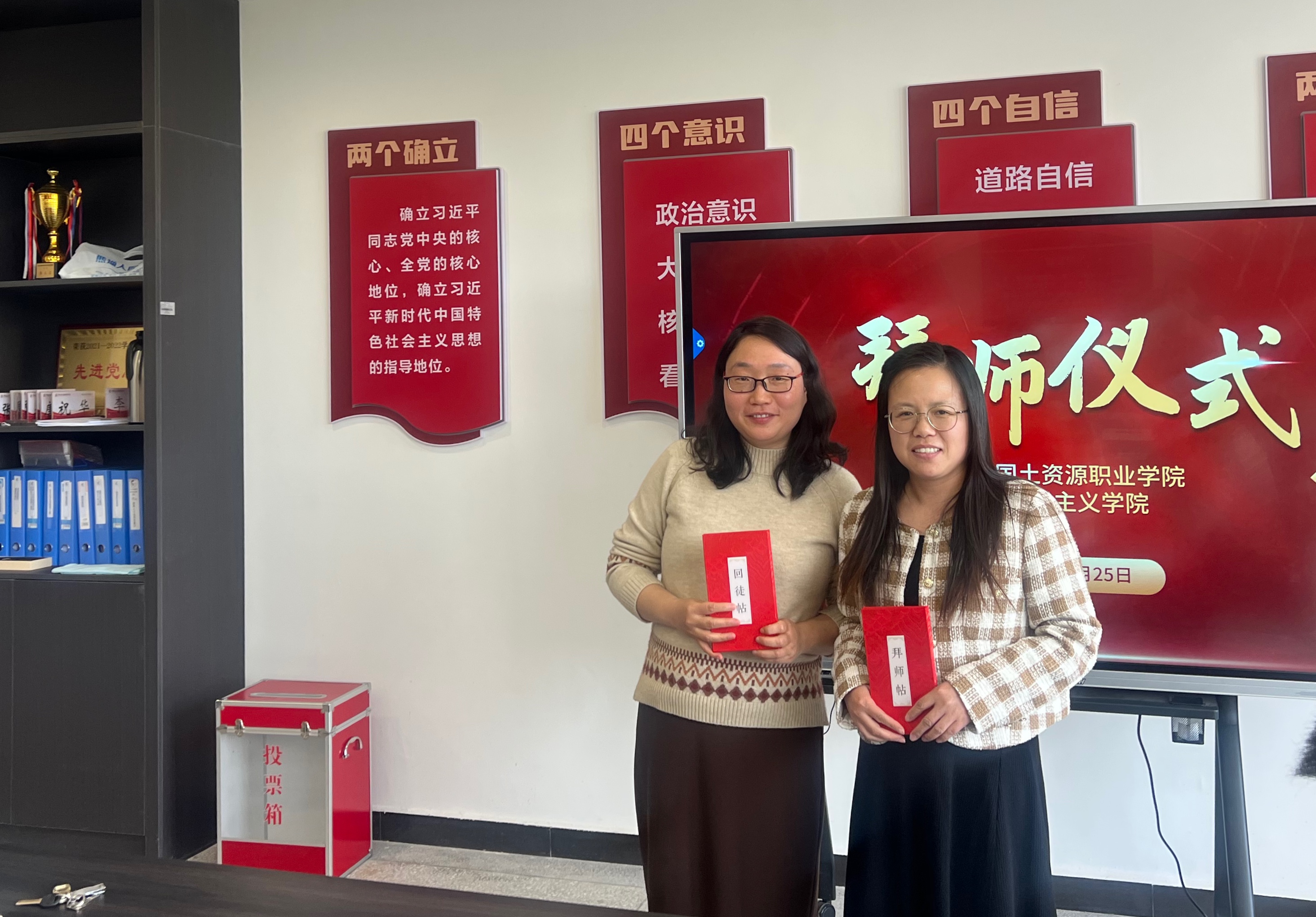 会议为新调入公司教师举行了拜师仪式,三对师徒互换师徒帖,互相帮扶,建强思政课教师队伍,提高思政课教学质量。
